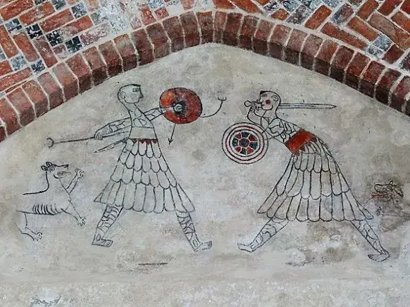 Image of two combatants fighting a judicial combat on the church in Westerwijtwerd (Groningen). This image depicts high medieval Frisians.